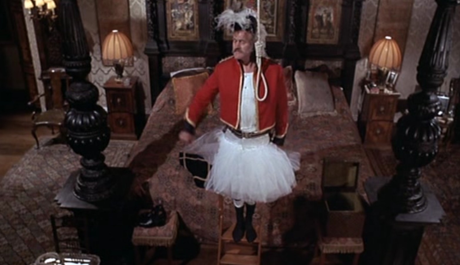 Тринадцатый лорд Гурней после заседания в палате просит своего верного дворецкого поставить лестницу, приготовить петлю и принести виски с содовой. После этого он надевает балетную пачку и, что называется, давай. Лорд произносит торжественную речь (что-то там про доблесть или около того), просовывает голову в петлю, аккуратно спрыгивает с лестницы с расчетом на то, что тут же достанет до нее ногами, но подлая деревянная конструкция падает, и Гурней умирает.